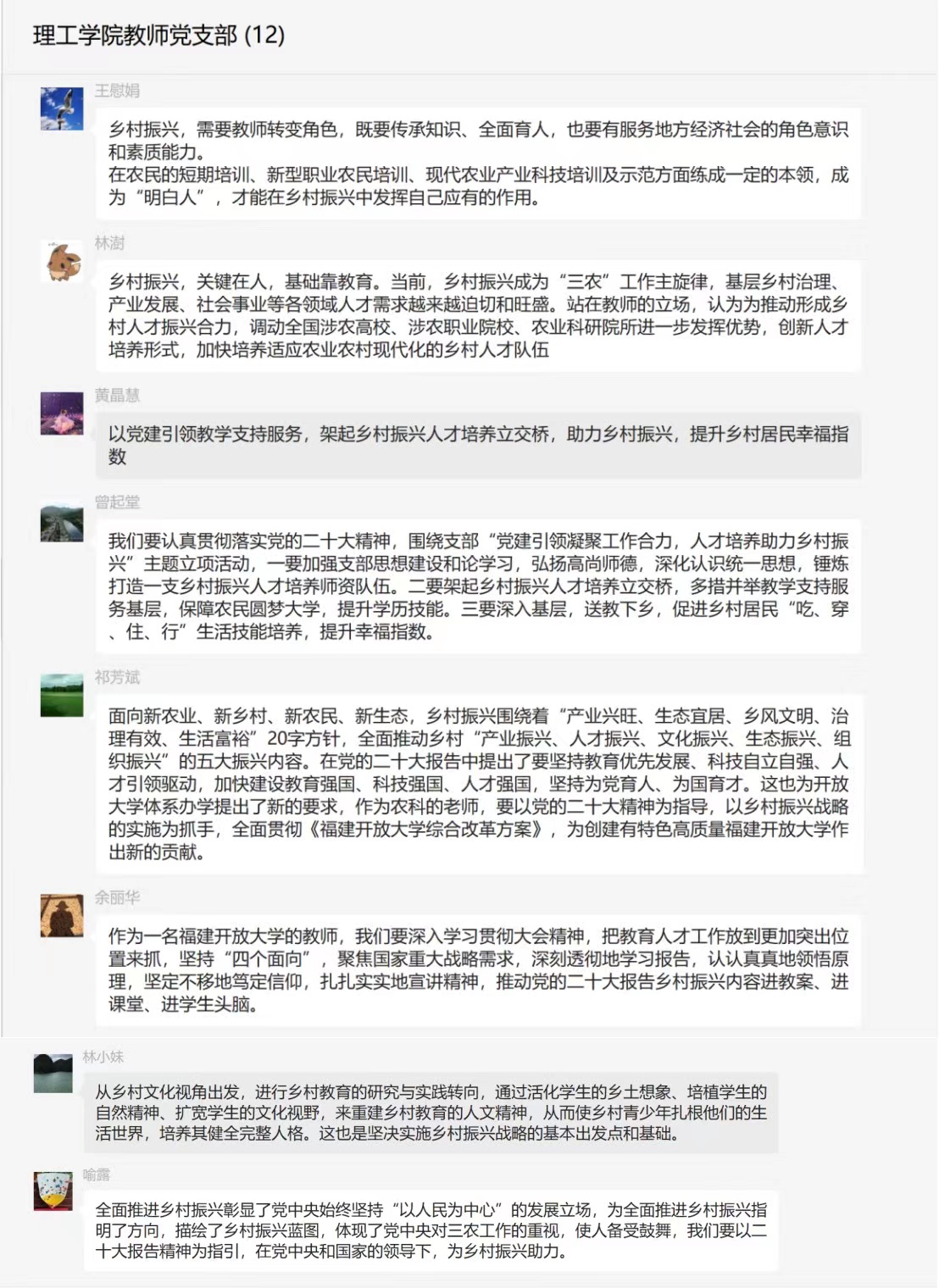 大家纷纷表示,要以党的二十大精神为指引,凝心聚力干事创业,重点突出乡村振兴基层发展实际问题,解难题、破困境,提升教育教学水平,为培养更多服务农业农村现代化建设的综合型农业匠人贡献学科力量。